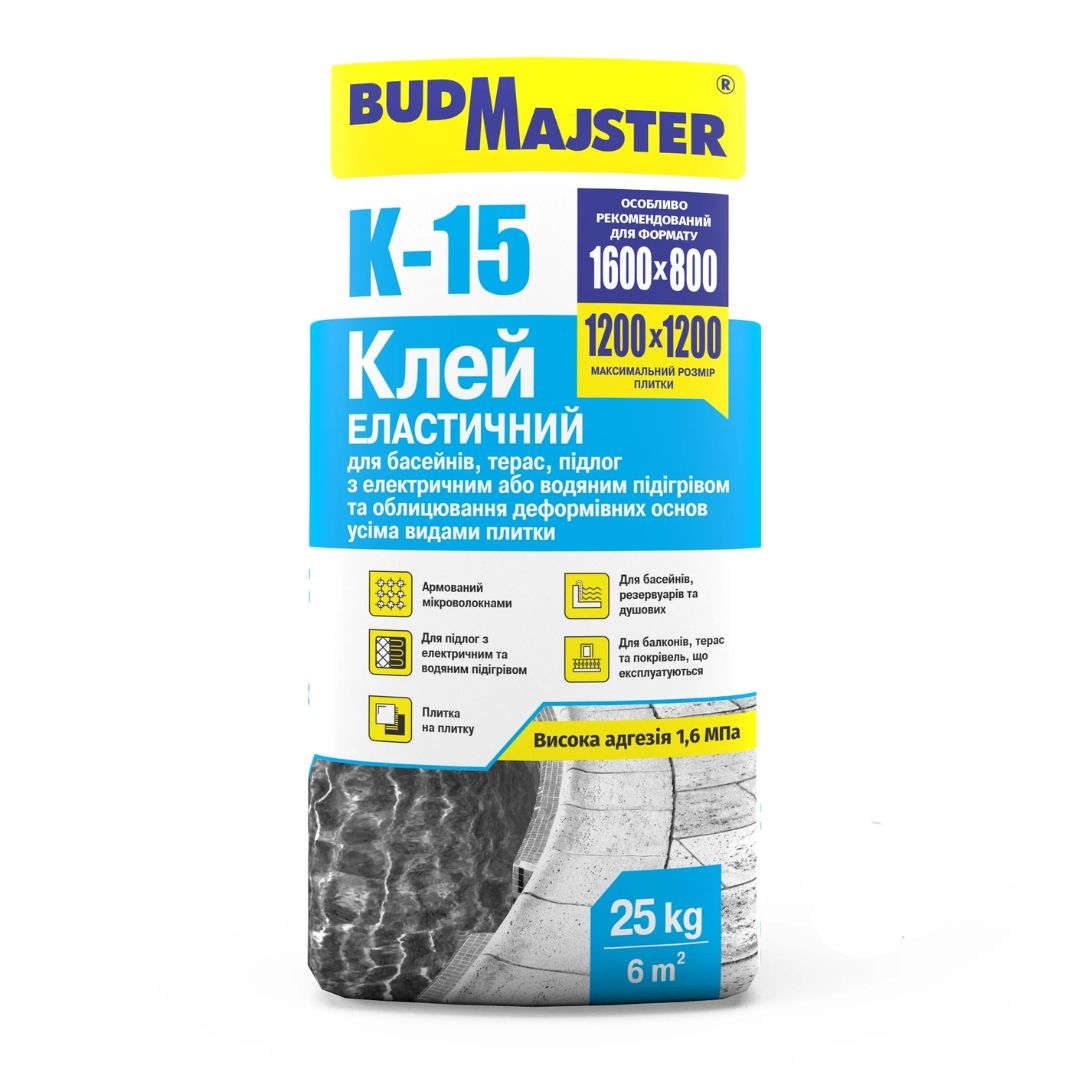 Клей K-15 предназначен для внутренней и наружной облицовки прочных минеральных оснований (тяжелый бетон, ячеистый бетон, кирпич, штукатурка, ГКЛ и т.п.) всеми видами природных и искусственных материалов на минеральной основе (декоративный камень, гранит, стекло, бетонная плитка и т.п.) максимальным размером 1200×1200 мм. Благодаря высокой эластичности применение клея эффективно на основаниях, подвергающихся периодической деформации, связанной с увлажнением и расширением (бассейны, резервуары, душевые, балконы, террасы, полы с электрическим и водяным подогревом, эксплуатируемые кровли и т.п.). Клей рекомендован для облицовки поверхности старых керамических плиток методом плитки на плитку, для тонкослойной кладки стеклоблоков и приклеивания стеклосетки (для светлых тонов применять клей K-25). Особенно рекомендован для облицовки лестниц и лестничных маршей, а также поверхностей полов, устраиваемых под наклоном. Для приклеивания мраморных плит рекомендуется использовать клей K-211. В особенности клей К-15 рекомендован для плитки 1600×800 мм.