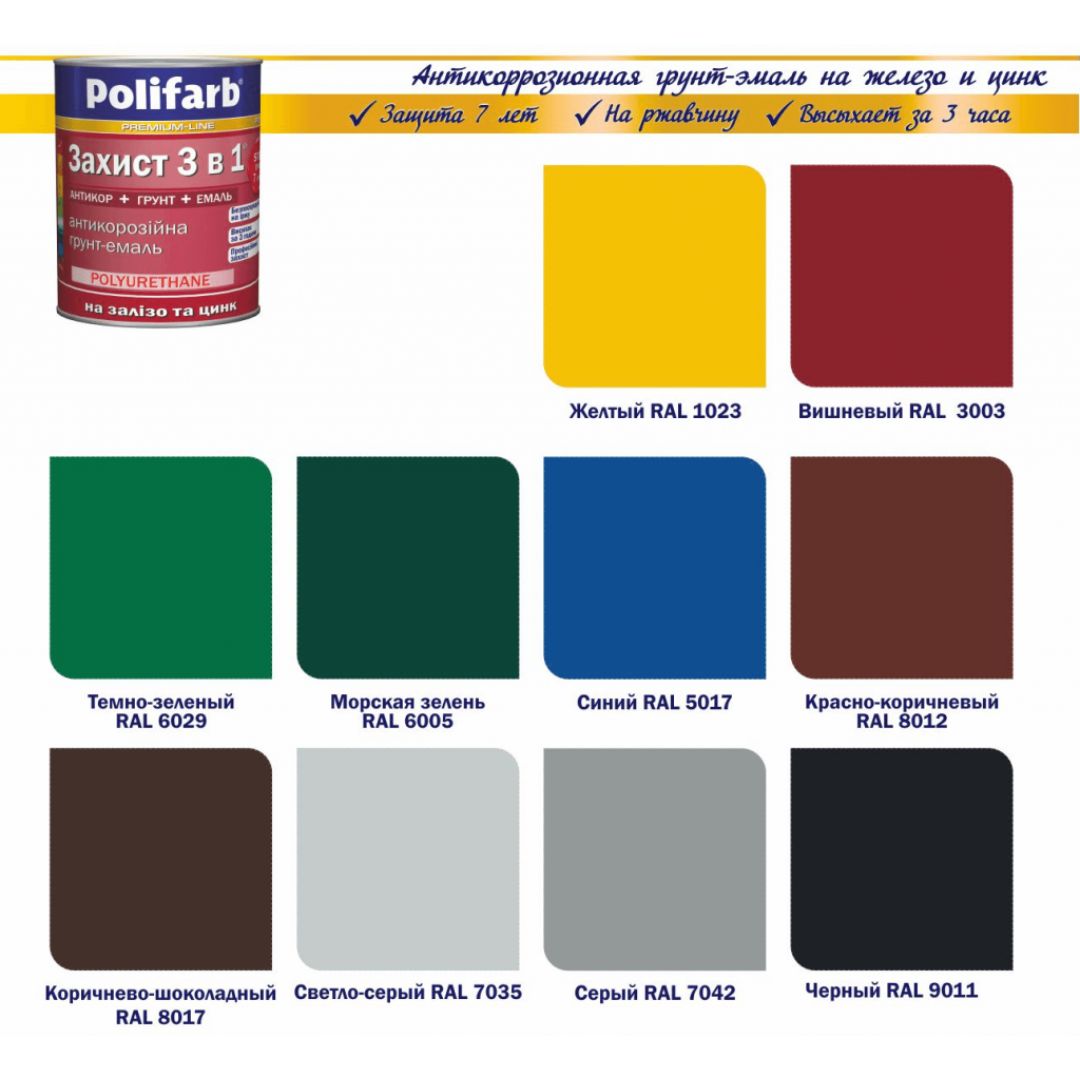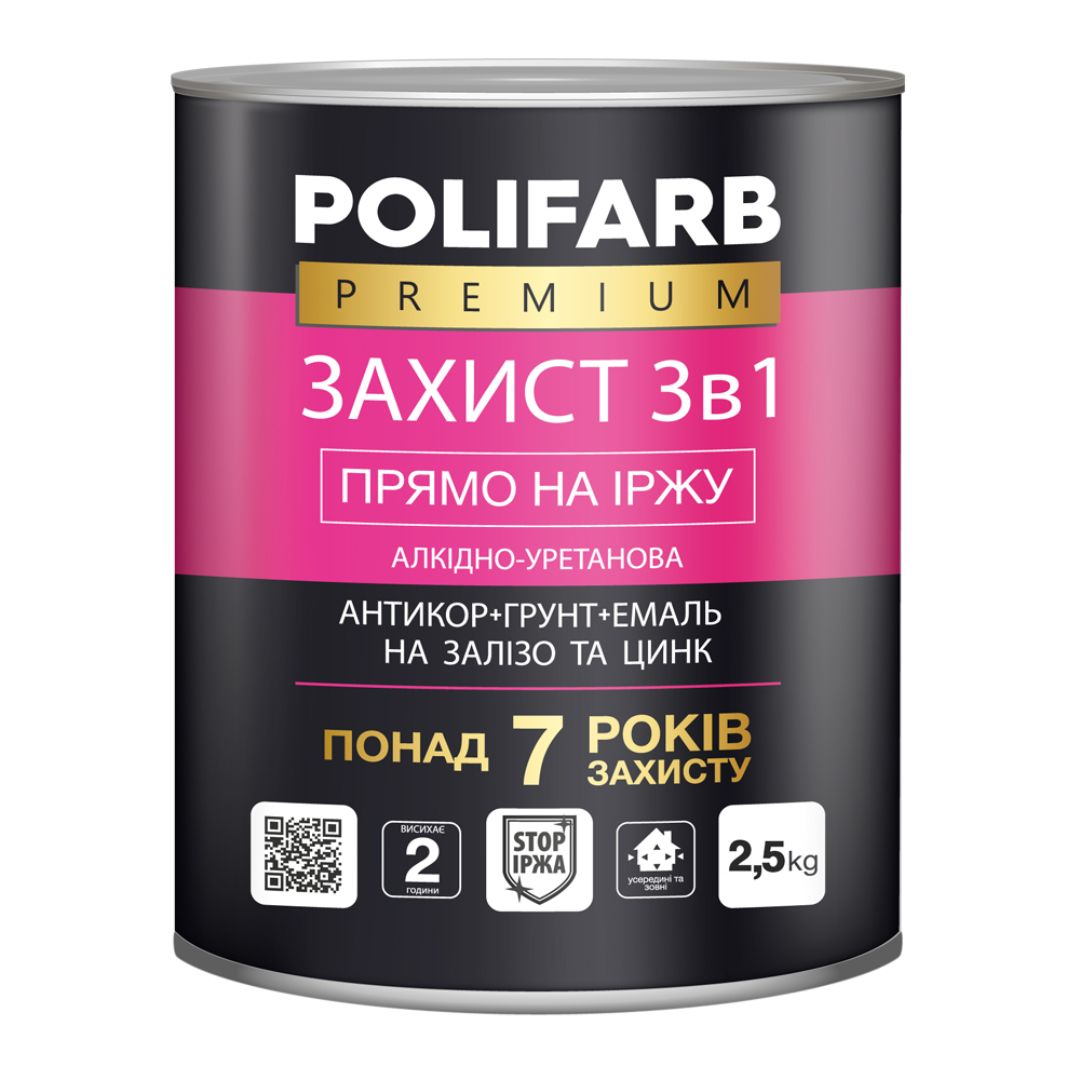 Антикорозійна алкідно-уретанова ґрунт-емаль ЗАХИСТ 3в1 ТМ POLIFARB призначена для нанесення безпосередньо на іржаві металеві поверхні — без попередньої ґрунтовки чи додаткової обробки. Формує надійне покриття, яке ефективно протистоїть корозії та атмосферному впливу. ЗАХИСТ 3в1 ТМ POLIFARB поєднує в собі функції антикору, ґрунтовки та емалі, що значно скорочує витрати часу та матеріалів при фарбуванні. Підходить для експлуатації в умовах підвищеної вологості, промислового середовища, на виробництві, зовнішніх і внутрішніх конструкціях. Ідеальна для фарбування устаткування, трубопроводів, ЛЕП, металевих каркасів, сталевих і оцинкованих деталей. Доступна палітра повністю відповідає системі RAL, що полегшує вибір кольору. •Преміальна якість. •Короткий час висихання – 2 години. •Захист понад 7 років. •Безпосередньо на іржу, без додаткових робіт. •Кольори відповідно до RAL.