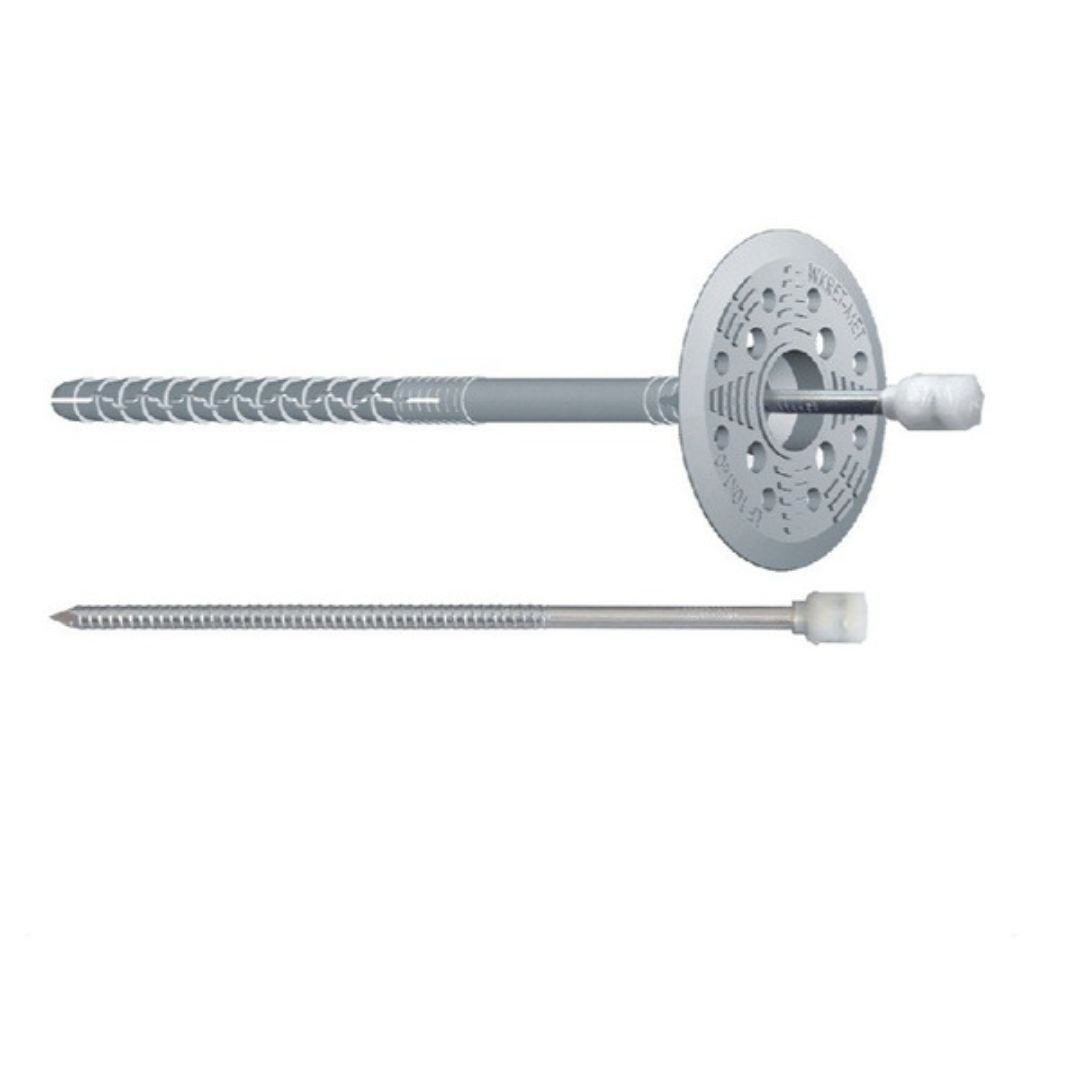 Дюбель фасадний з металевим стрижнем, термоголовкою та подовженою розпірною базою, 260 мм призначений для механічного кріплення пінополістирольного, мінераловатного плитного утеплювача та для механічного кріплення протипожежних мінераловатних поясів у системах скріпленої зовнішньої теплоізоляції будівель та споруд. Для всіх типів основ включаючи пористі бетон та газоблок. Довжина розпірної бази 8см.